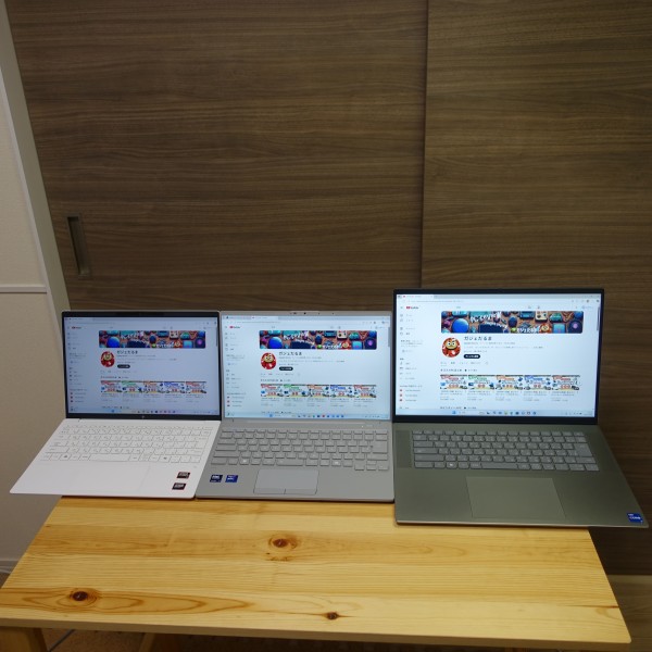 13.3インチ/16インチノートPCを並べてみました(上の画像の左:13.3インチPC (縦横比16:10)/真ん中:レビュー機(14インチ/縦横比16:10)/右:16インチPC (縦横比16:10))。