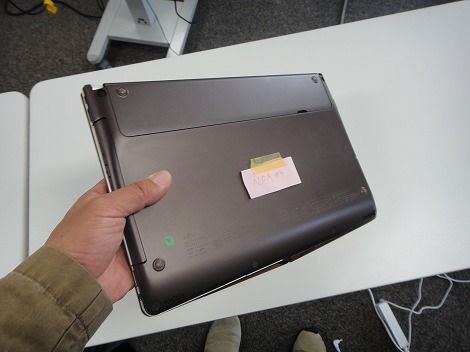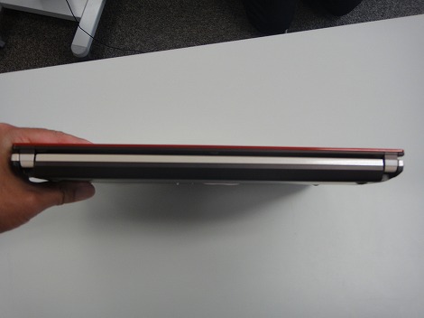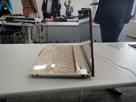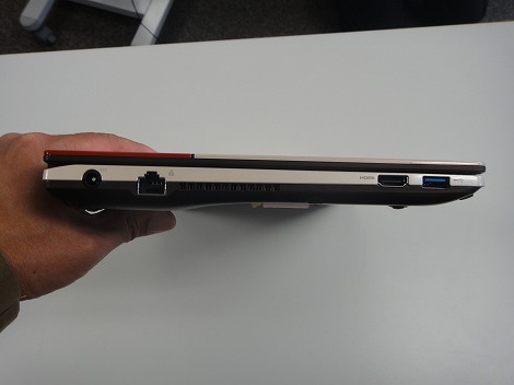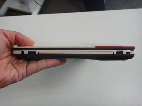右側面部。高額ドライブ(DVDスーパーマルチドライブ)、USB3.0×2、ヘッドホン端子が配置されています。先代モデルでは、光学ドライブが搭載されていなかったのですが、今回のユーザーの要望を受けて搭載することになったそうです。